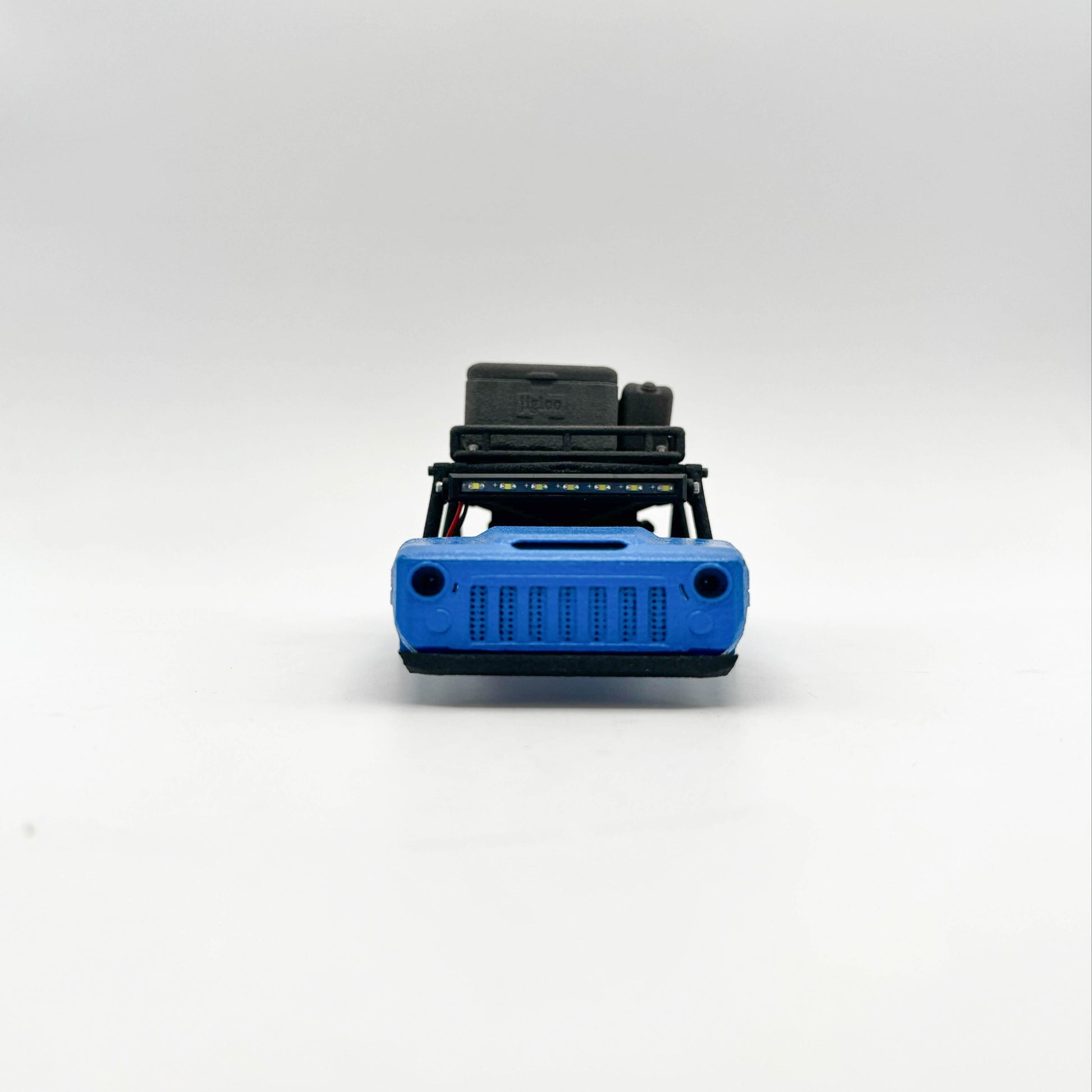 - Shown painted blue with optional light bar, small roof rack, "Jigloo" Cooler, and oil jug not included.
